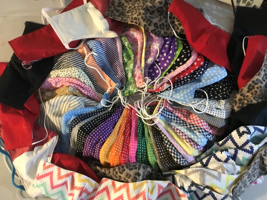 Late last month, the package of fabric squares finally arrived, and I picked through my assortment way more excited than I should have been, given the point of the whole thing. I took the patterns I wanted people to see and cut them for the outer layer, then cut the flowery ones I wasn’t inclined to wear anywhere and used those to line many of the masks, falling back on my old solid-colored pillowcases when I ran out of the squares.